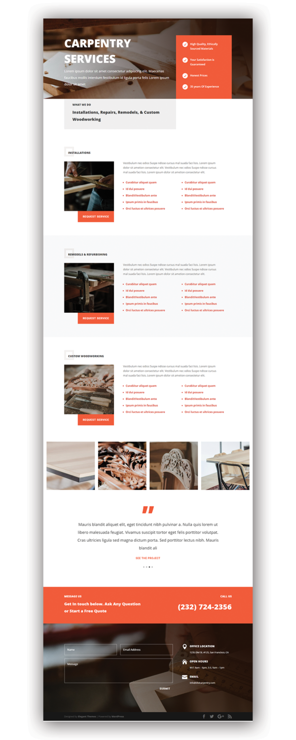 This WordPress theme is specially designed for all kind of Carpenter sites and businesses. The most common usage includes carpenter, construction, handyman, Repairing websites. The theme has beautiful and unique design that will make your website stand out. It has 100% responsive design and tested on all major hand-held devices.The theme comes with all necessary features for your online presence like projects, blog, testimonial and team page etc. The admin panel is really easy to use and you can import the sample content in 1-click, making the initial setup look like in the demo and thus getting a solid base to start working with. Add the myriads of other options provided and we can claim with confidence that it will be a great choice for your online presence.